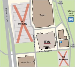 - Do not park in the Potomac Yard Center (Target) lot or empty pavement directly across from the IDA building on Seaton Ave; towing is enforced.